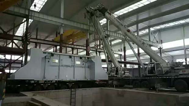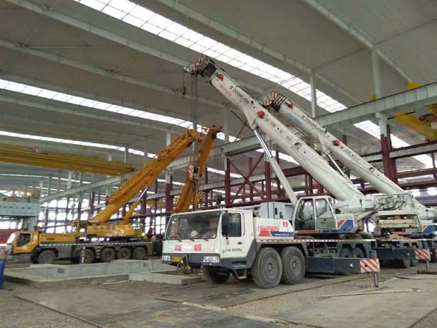 青島泰力起重安裝有限公司動用三臺110噸 1臺130噸吊車聯手配合抬裝190噸德國進口設備助力一汽大眾奧迪設備搬運吊裝安裝現場。